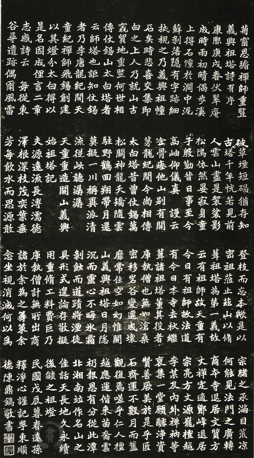 今天下禪宗之宗太白,比梁大同中之宗少室,唐永隆前後之宗寶林,較為尤盛。甬東三佛國,諸佛化身,應現其地,相傳太白得名最久。在吳赤烏閒,興師住此山。永康間,忽有童子來侍師,久而辭去,詢之,曰:“我非他,即金天太白星也。帝慕師篤于道行,使執役焉。”是時名其山曰太白,寺曰天童。今上康熈八年(公元1669年),壽昌菊窗璿(音璇,xuan2)公,結茅于寺南,澗中得石幢,乃師之塔石。就澗數百武(半步),舊有塔基,因豎建焉。師在當時,初祖(达摩,公元520年)未入,凡東南名僧,率以高座講論相矜高;而師獨孤居兹山,徙倚于玲巒蓊薈之鄉,一似初祖面壁。而東禪之坐碓者,則是天童捆奧(阃奥:比喻学问或事理的精微深奥所在),師實開之。宜乎雞足之藏,歷數世而彌顯也。然而璿公翳剔之功,何可泯哉?歲在戊寅,因重構塔亭而請為之記,遂作頌曰: